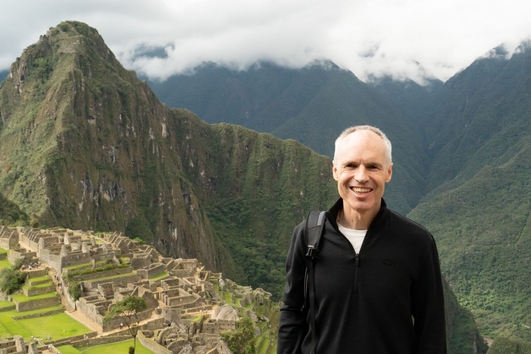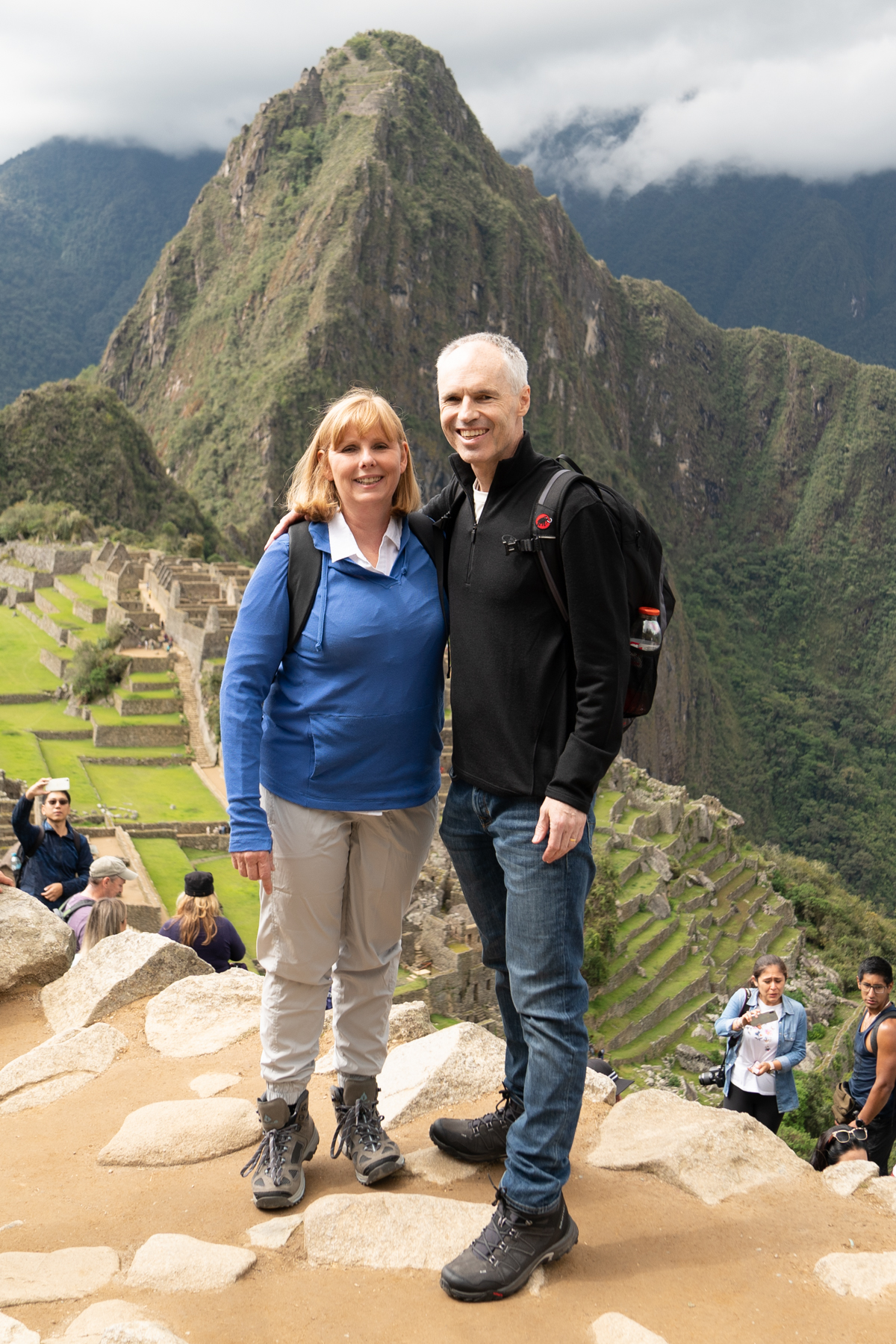 The citadel sits at an elevation of about 2,400m, which is about 900m lower than the town of Cusco. However, the climbs inside the citadel are very steep in parts and we certainly noticed that it was easy to end up short of breath. Not long into the first set of steep steps, Keith’s chicken consommé decided to make an unwanted reappearance! Navigating Machu Picchu in fine health can be challenging but doing it with a dose of gastro certainly adds to the degree of difficulty! Our guide, Graham, was very understanding and did a wonderful job of making sure that we could push on. Andrea, on the other hand, had met a lovely English couple, Simon and Mags, and was far more interested in chatting with them than looking after Keith (which was fair enough!).