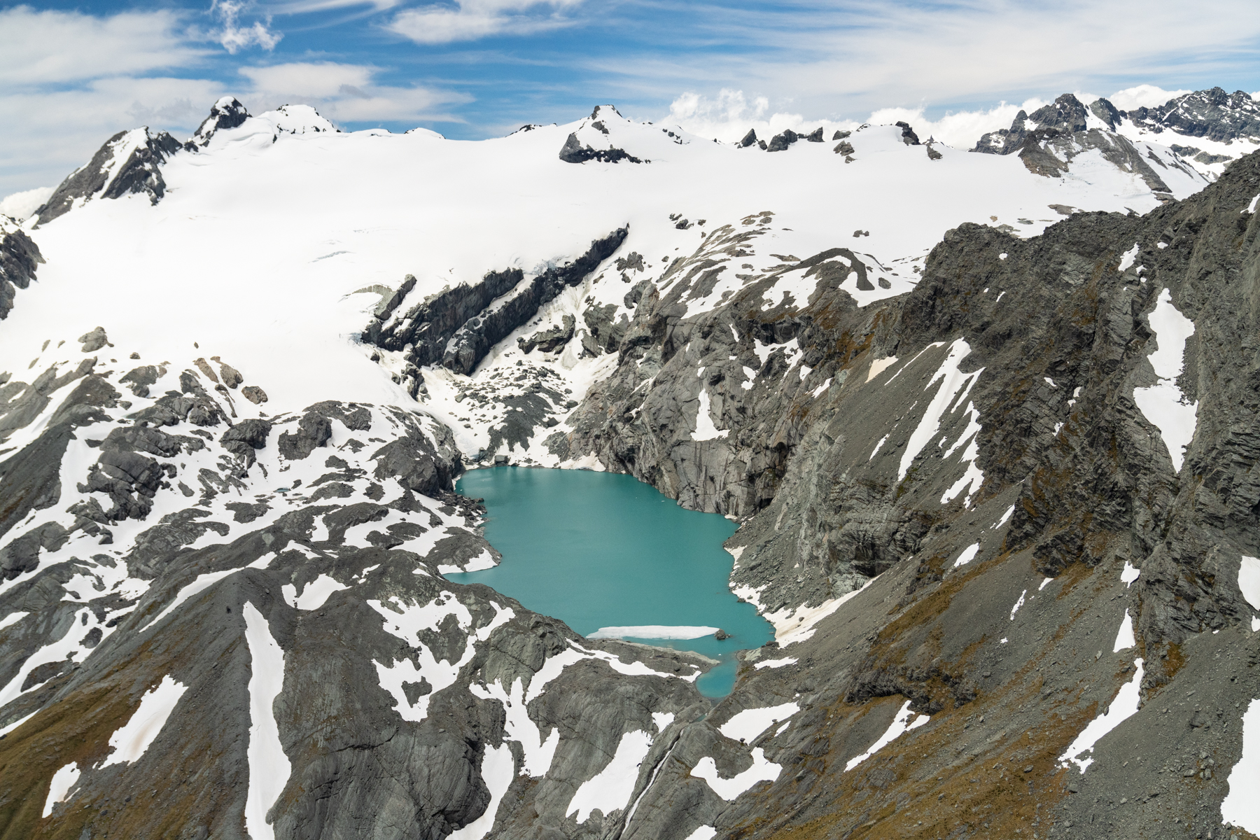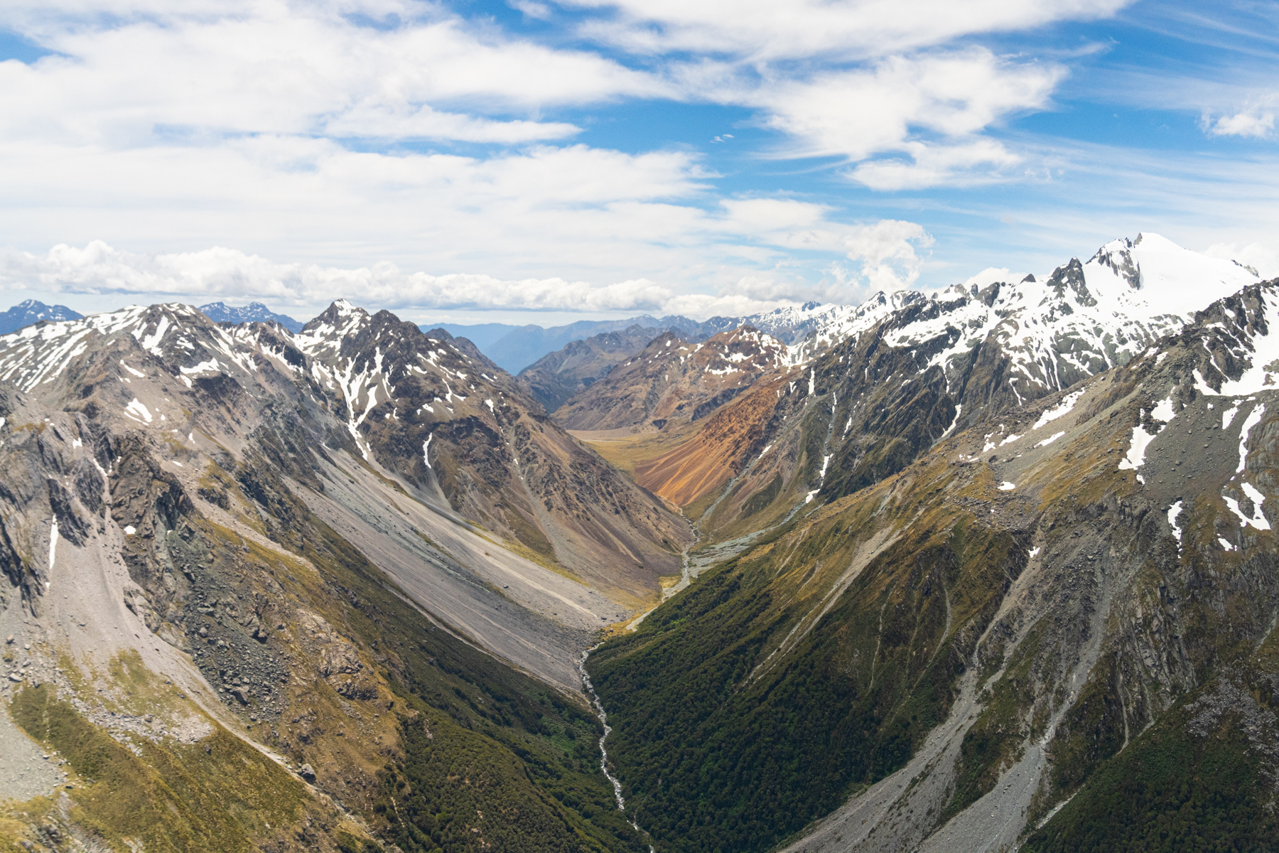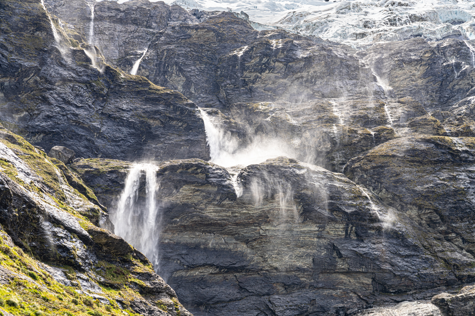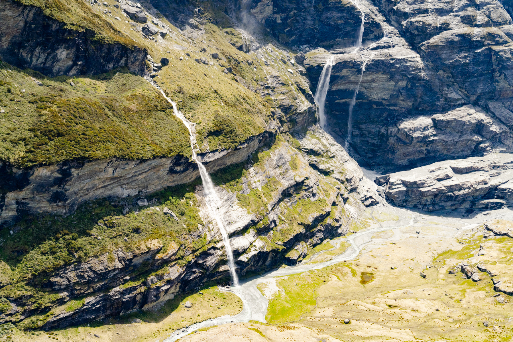 We flew over Mount Earnslaw and dropped into the valley below, where we landed in a small clearing to get a close-up look at Gilkison Falls, at the head of the Earnslaw Burn. This is a beautiful spot and many people make the 6-8 hour trek in to see it (especially if they are Tolkien fans since this area features heavily in the Tolkien movies). It’s certainly much easier to fly in!